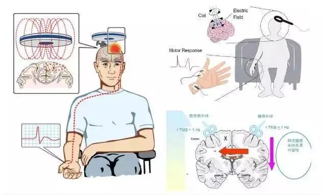经颅磁刺激利用高压电流通过线圈,产生快速变化的磁场。将这种快速变化的磁场作用于大脑皮质一定区域或相对应的颅骨表面,于是磁场产生感应电流,此可改变该区域神经细胞兴奋性。神经细胞兴奋性的变化,在效应器上能够被记录下来,经颅磁通过双相调节大脑兴奋与抑制功能之间的平衡来治疗疾病。