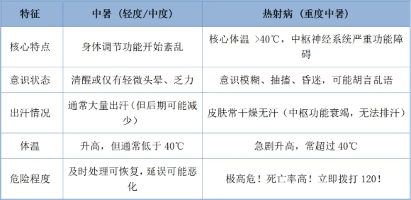 简单记忆法:一旦在高温环境下出现体温极高(摸额头烫手)、意识不清(叫不醒或胡言乱语)、皮肤干热(摸不到汗),立即想到热射病!这是与死神赛跑的时刻!