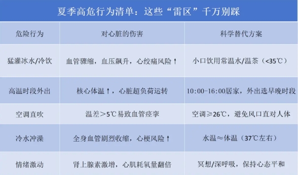 人体为散热扩张体表血管,导致心脏供血被“分流”。同时血压波动加剧,心脏负荷加重,诱发心绞痛甚至心梗。