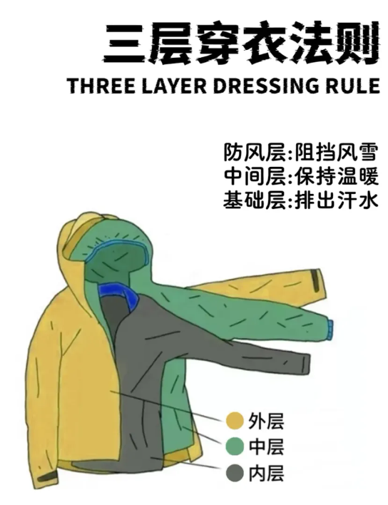 采用“三层穿衣法”——内层排汗、中层保暖、外层防风,避免单件厚重衣物造成的温差过大,重点部位防护头部、颈部、手部和脚部。