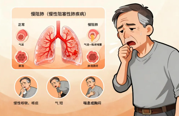 慢阻肺不是单一的疾病,而是涵盖慢性支气管炎和肺气肿的一组病症。它的核心特征是气道变窄、肺泡结构破坏,导致空气进出肺部受阻。患者常描述为“像带着口罩呼吸”或“感觉永远吸不够气”。