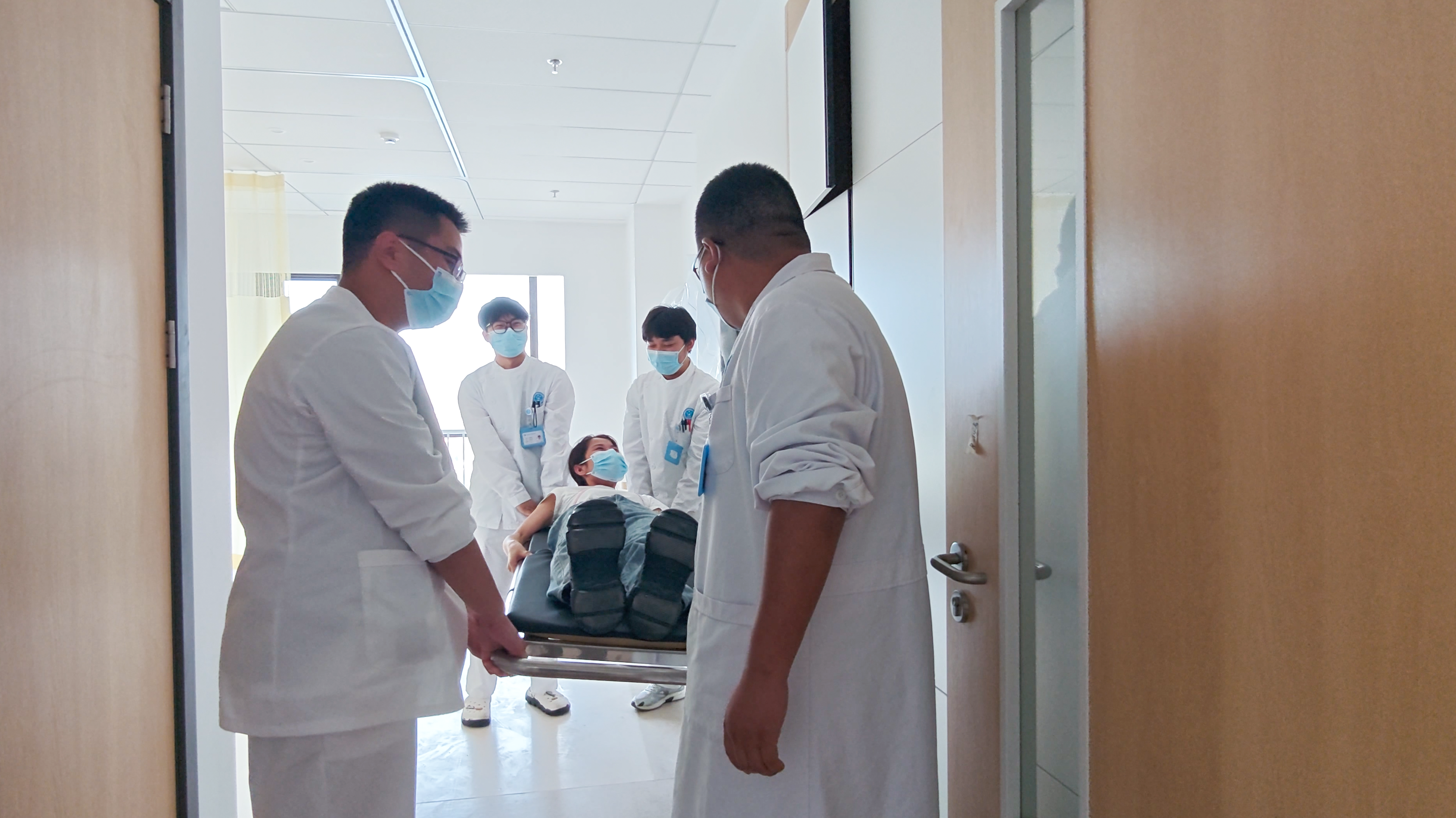 病区楼层较高,人员较多,安全演练成为重中之重。我院采取双通道分流,健全人员经东西两侧消防通道撤离,行动不便患者经专属通道转移。随即,医护人员各司其职,在保持持续疏散尚有行动能力的病人同时,采用搀扶辅助、轮椅、担架抬起等方式疏散,确保及时将行动不便的病人从危险中带离。