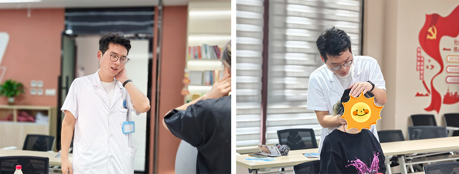 最后,同行的外科任鑫磊医生现场演示了舒缓肩颈的推拿手法,并建议: