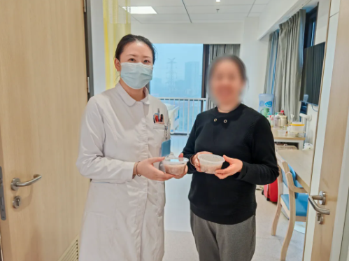 护理部邹主任和护士们在每个病区一边分发腊八粥,一边与患者及家属亲切交谈,了解他们的康复进展和需求。